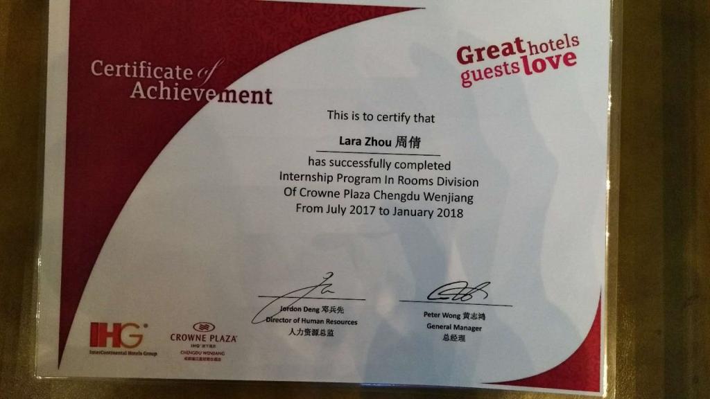 图4洲际酒店集团(IHG)荣誉实习生证书